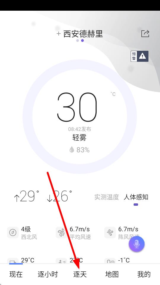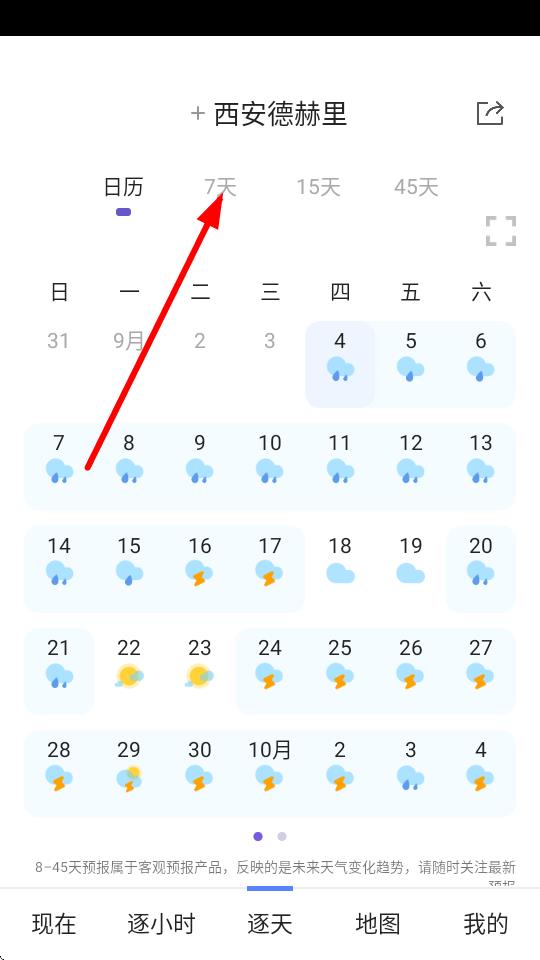 1、打开中国天气APP,在主界面点击下方导航栏中的逐天选项。