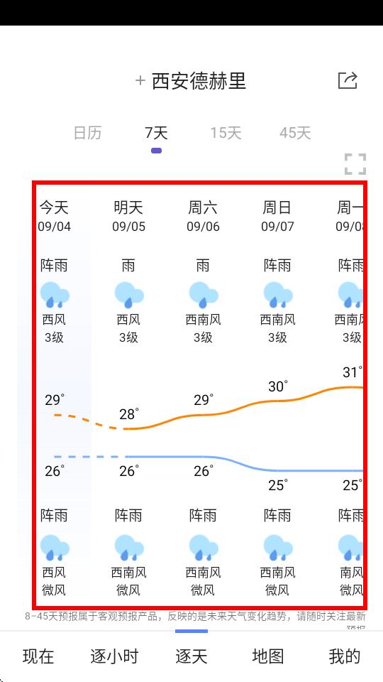 3、页面会展示未来一周的天气预报,包括每天的天气状况、风向风力、最高和最低气温等信息。