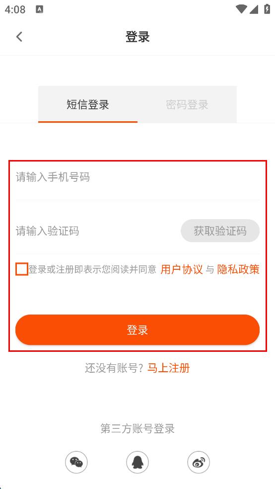 3、在验证码登录界面,输入手机号,勾选“隐私权限”,点击“获取验证码”。