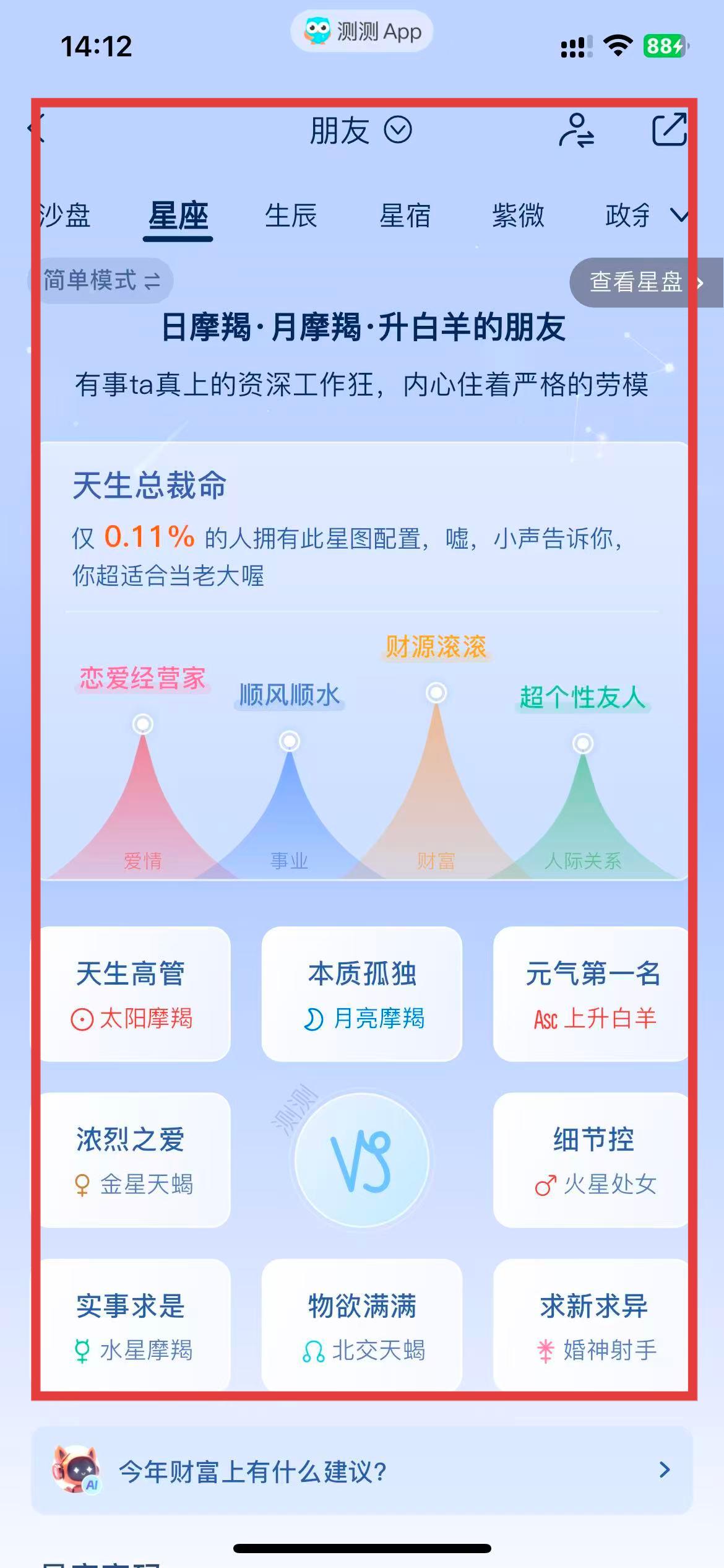 4、进入所选档案的星座分析页面,查看对方的星座分析结果。