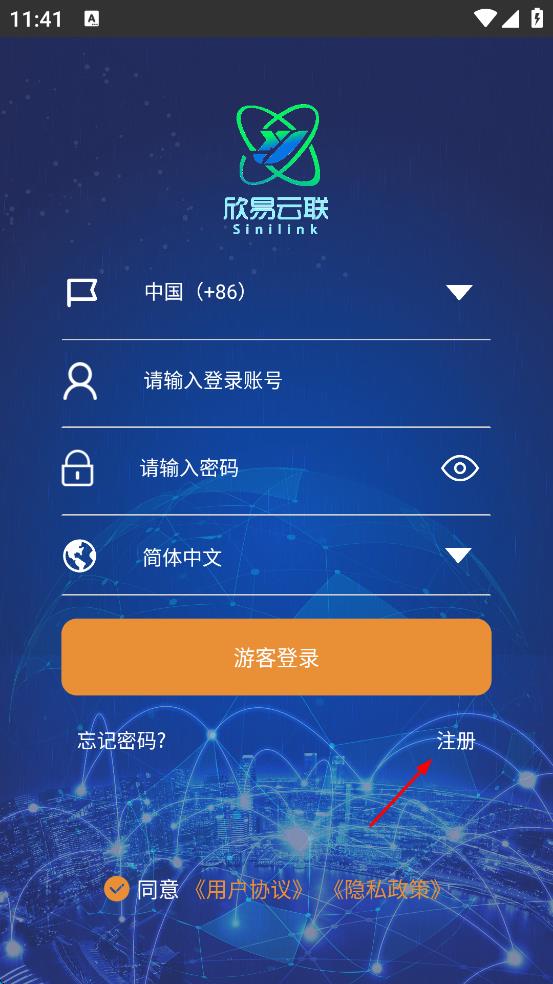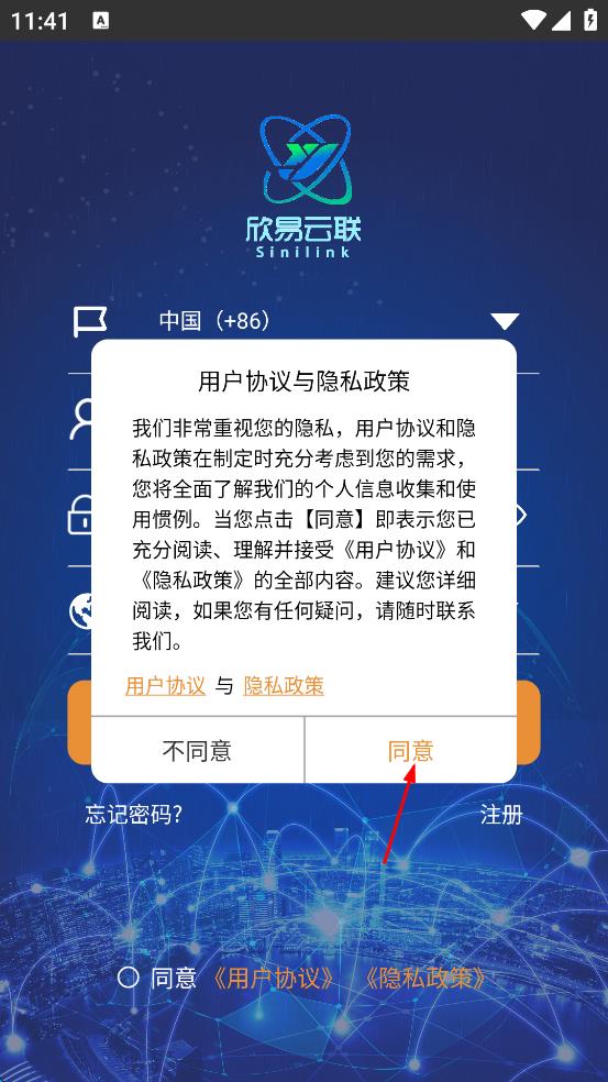 1、打开欣易云联,会出现用户协议与隐私政策界面,仔细阅读后点击“同意”,进入登录页面。