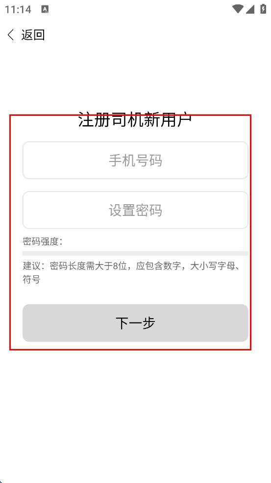 4、在注册司机新用户页面,输入手机号码,设置符合要求的密码,点击“下一步”,按提示完成后续注册流程,再进行登录。