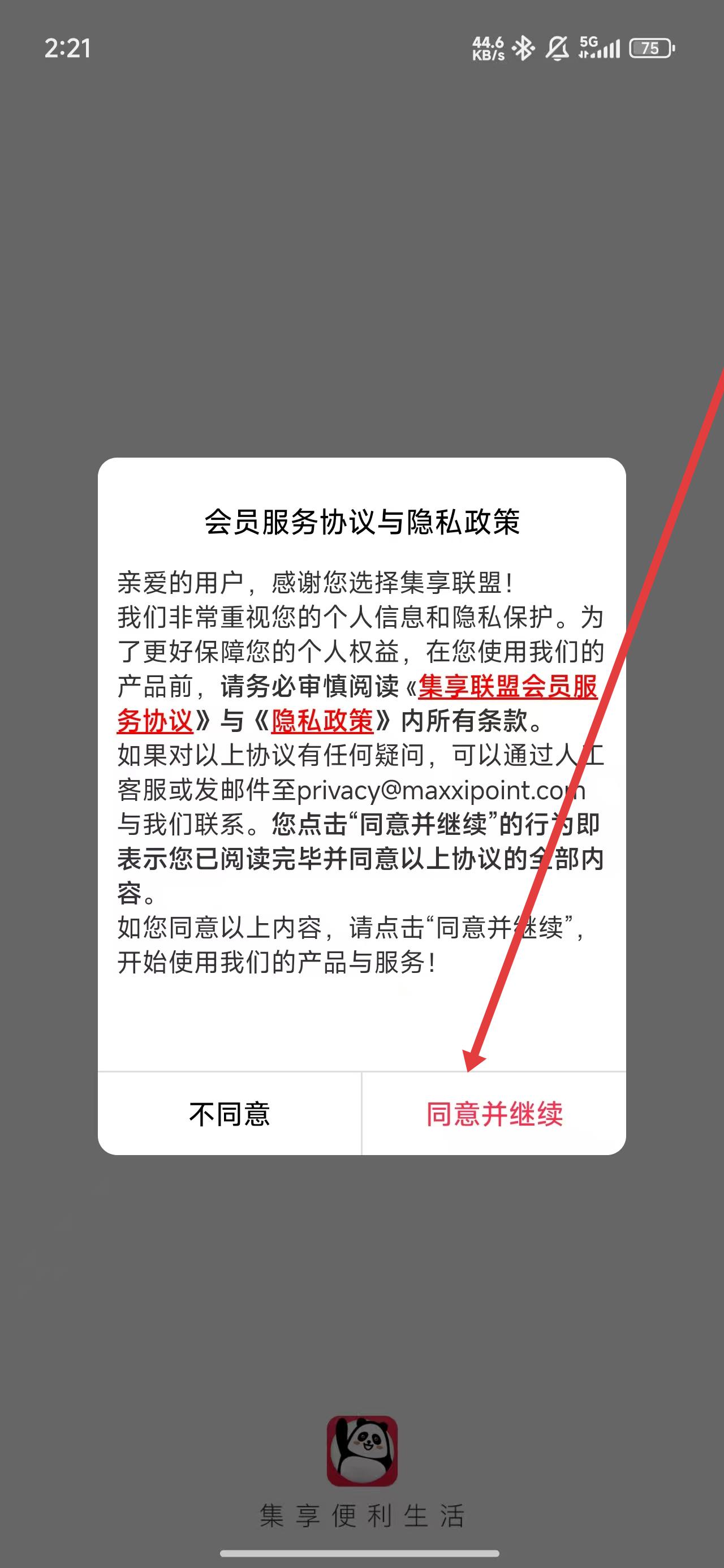 1、在打开app后,点击弹窗中的同意并继续按钮,进入使用。
