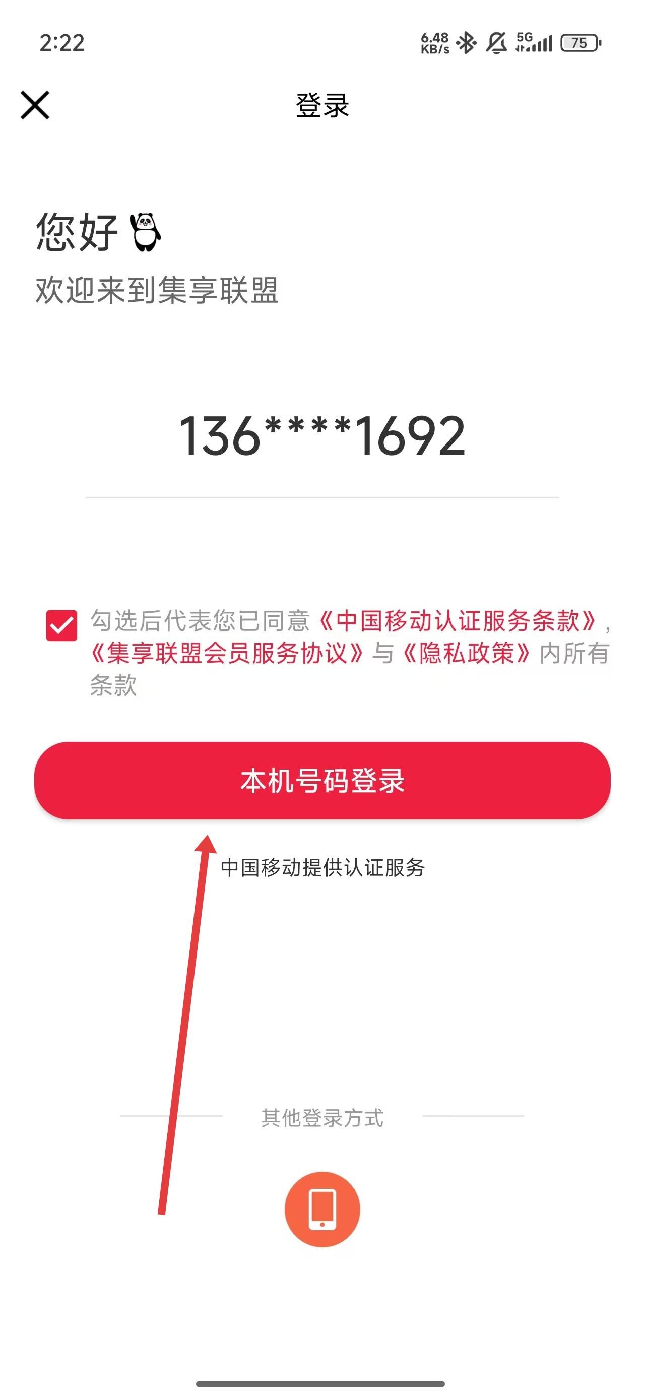 4、在进入到登录页面后,可以点击本机号码登录按钮一键登录。