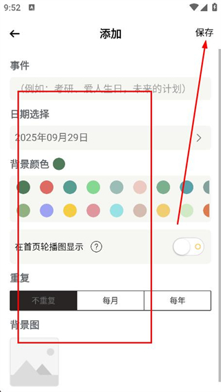 4、填写信息,点击右上角保存,即可添加倒数日。