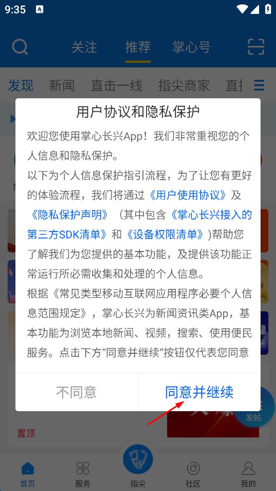 1、打开掌心长兴App,出现用户协议和隐私保护弹窗,阅读后点击同意并继续按钮。