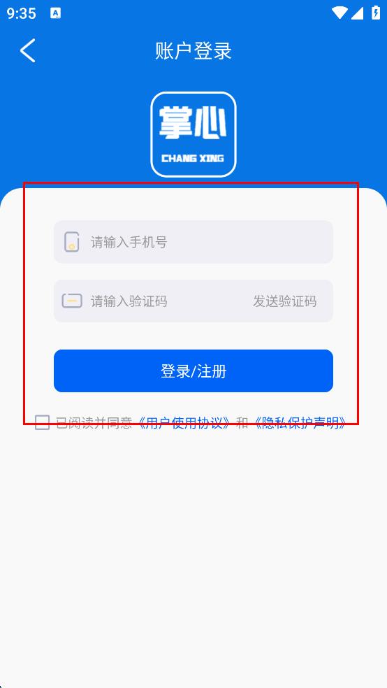 4、在账户登录页面输入手机号,点击发送验证码,收到后输入验证码,勾选已阅读并同意相关协议,点击登录/注册按钮完成操作。
