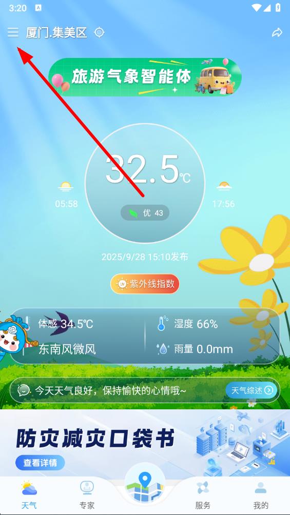 1、打开知天气app,点击左上角显示城市名称位置进入城市管理页面。