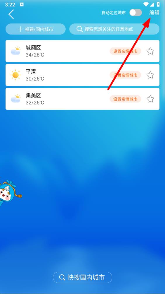 2、在城市管理页面,点击右上角编辑按钮进入编辑状态。