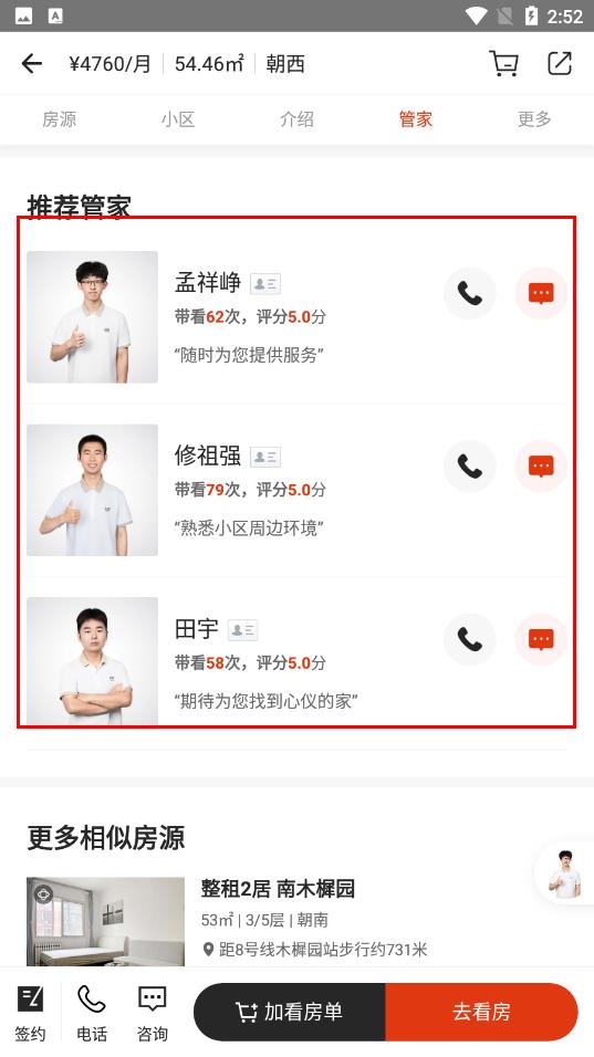 4、看到为该房源服务的推荐管家信息,包括照片、姓名、带看次数、评分以及服务介绍等。
