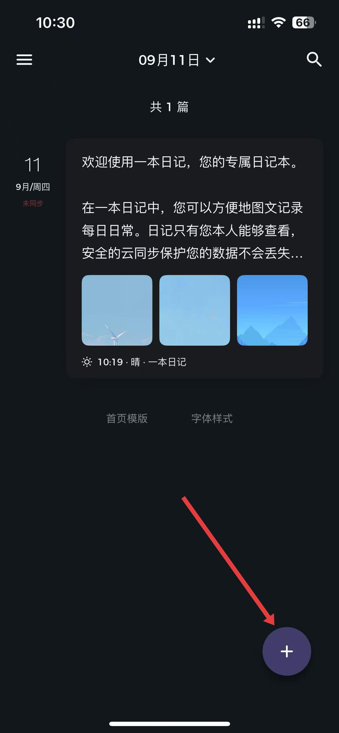 1、打开一本日记app,进入主界面后,点击右下角带有加号的紫色按钮,新建一篇日记。