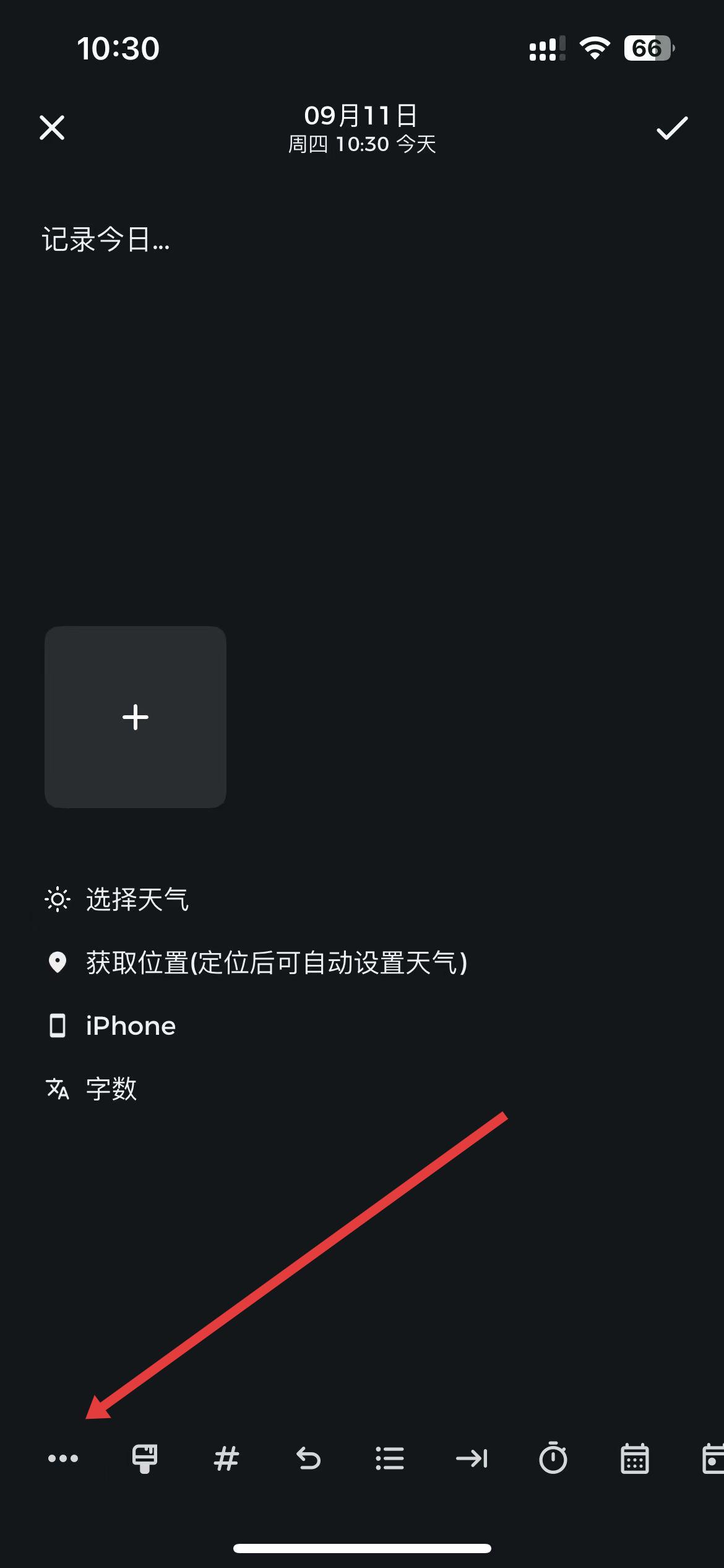 2、在日记编辑界面,输入日记内容后,点击下方功能栏中最左侧的更多选项按钮。