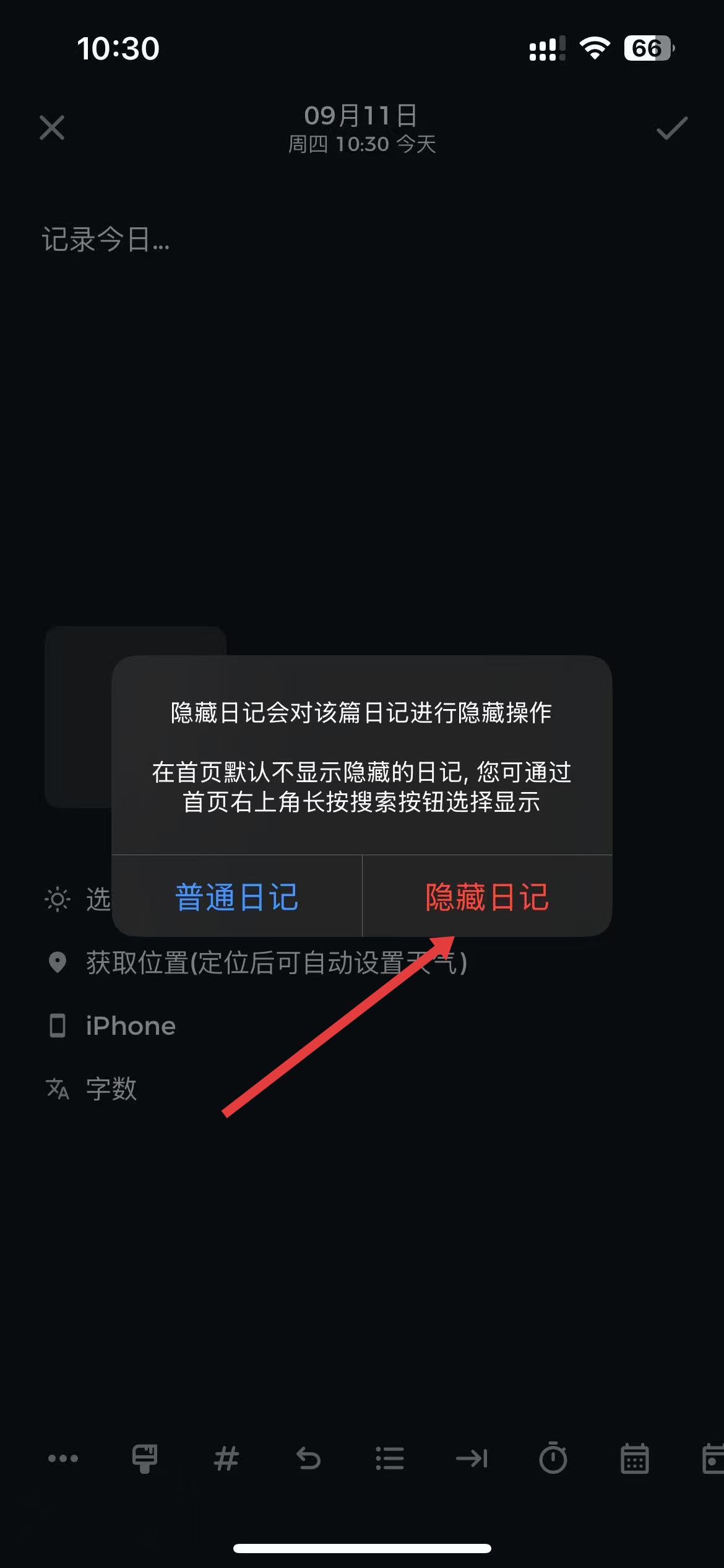 4、在弹出的确认提示框中,点击隐藏日记,即可成功将该篇日记设置为隐藏状态。