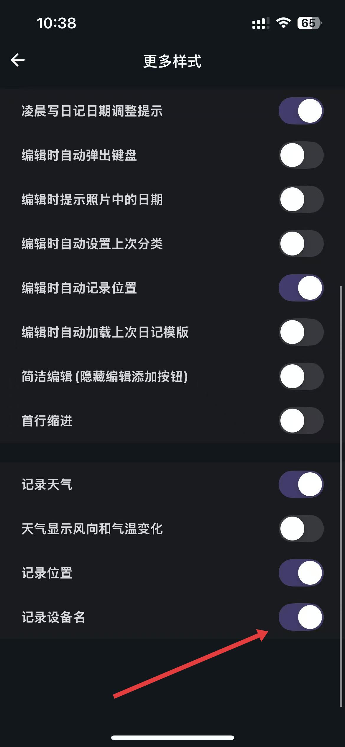 4、在更多样式设置页面里,找到记录设备名选项,点击其右侧开关将其关闭,即可不显示手机型号。