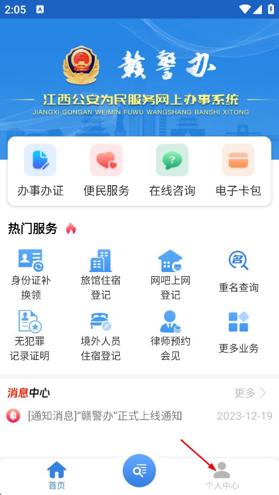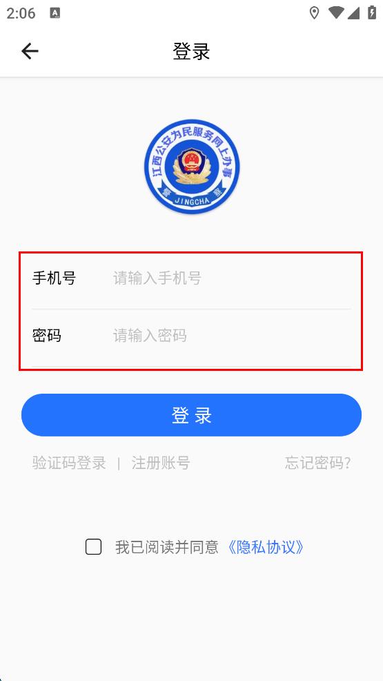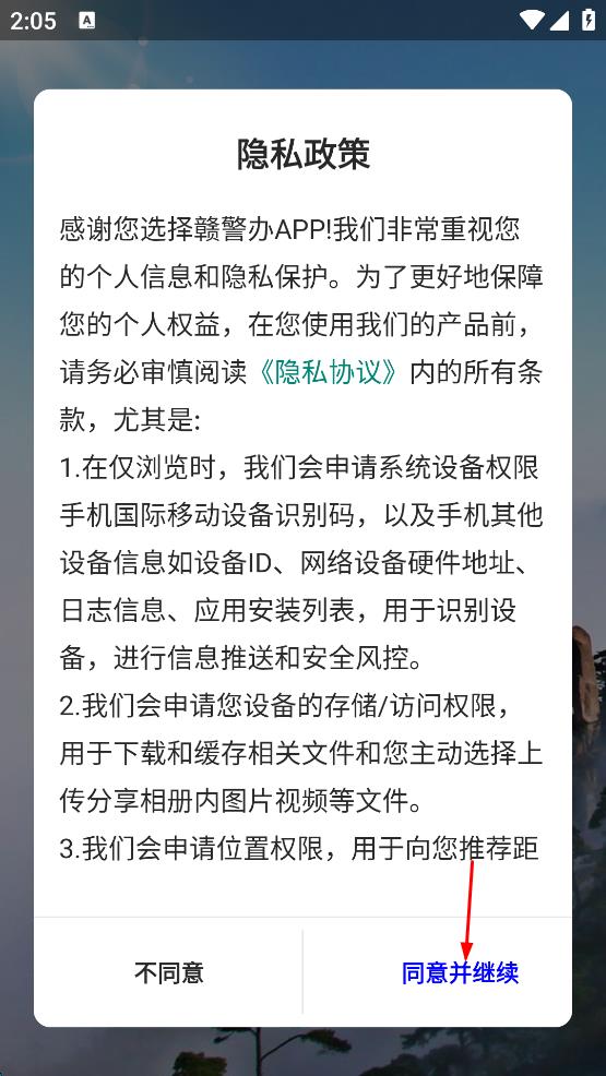 1、打开赣警办App,出现隐私政策弹窗,阅读后点击同意并继续按钮。