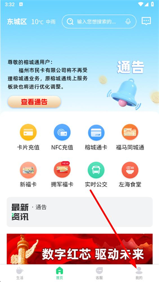 1、打开榕城通app,在首页下方点击我的,进入个人相关页面。