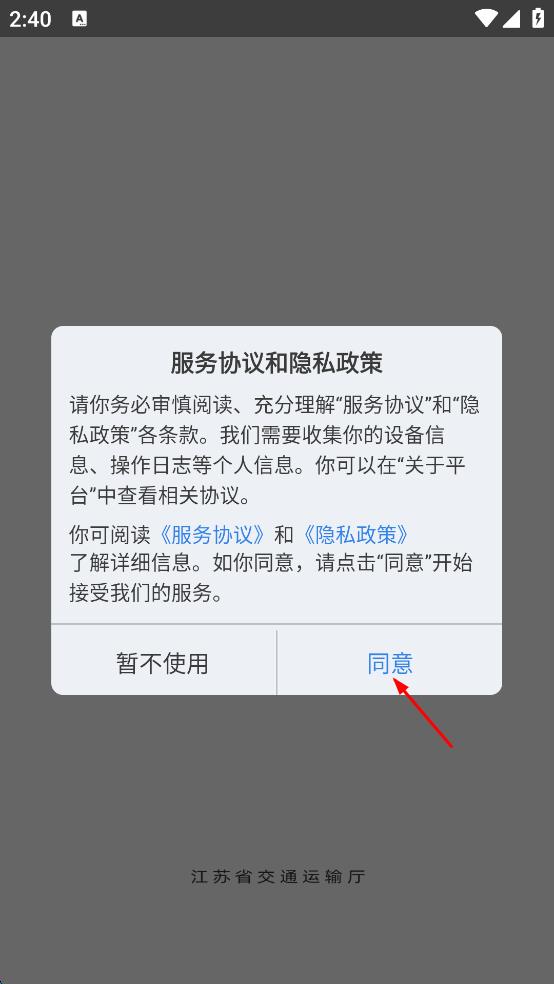 1、打开江苏交通,在弹出的服务协议和隐私政策页面,点击同意,进入江苏交通首页。