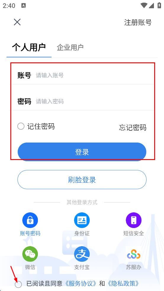 4、在登录页面,输入账号和密码,勾选已阅读且同意相关协议和政策,点击登录,即可完成江苏交通的登录。