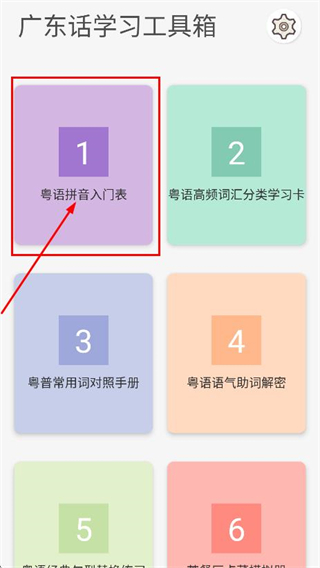 2、在学习工具箱页面,点击粤语拼音入门表,进入粤语拼音入门表页面。
