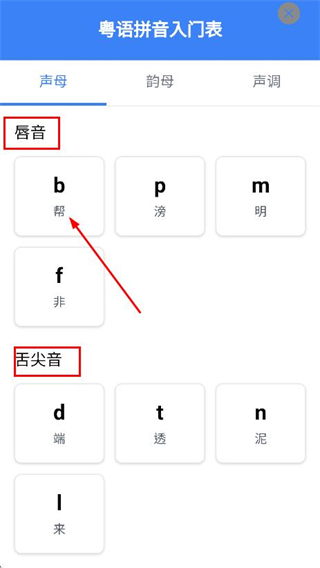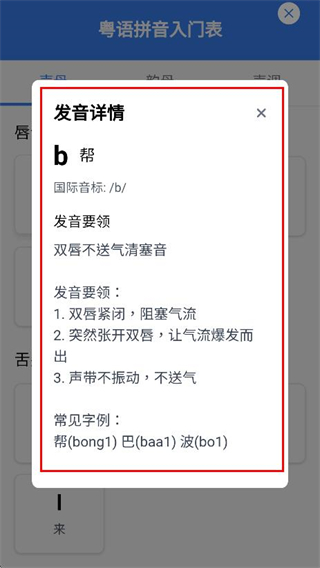 3、在粤语拼音入门表页面,点击想要查看的拼音,弹出该拼音的发音详情。