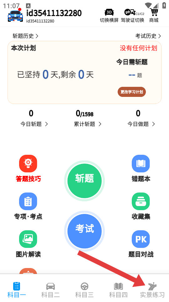 1、在驾考模拟3D主界面,点击底部导航栏最右侧的实景练习,进入实景练习页面。