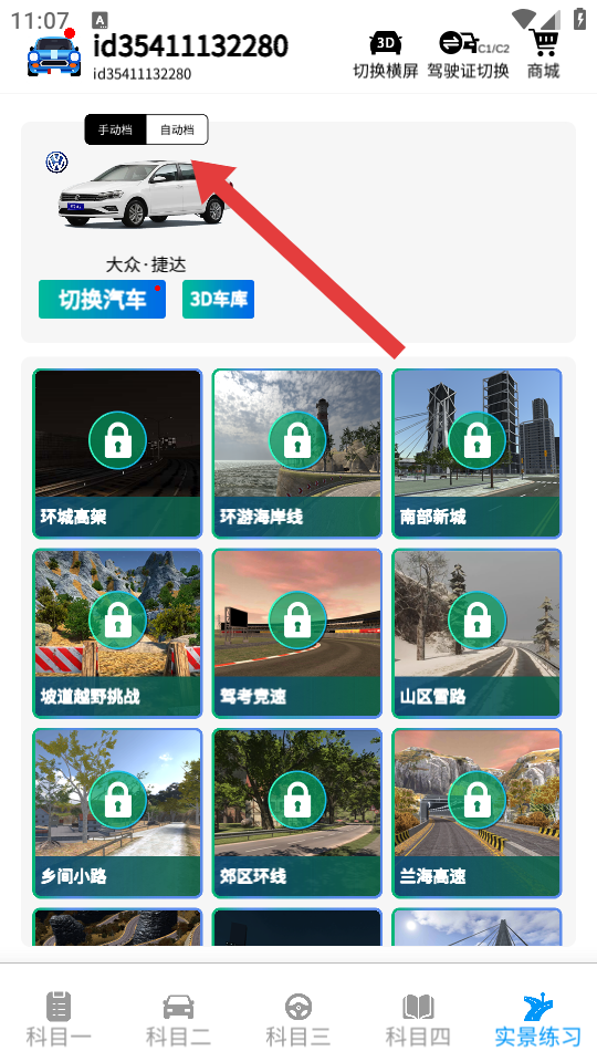 2、在实景练习页面顶部,点击自动挡选项,切换驾驶模式为自动挡。