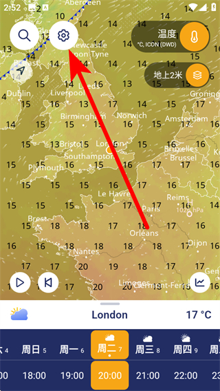 1、在ventusky的主界面,点击上方设置图标,进入设置的页面。