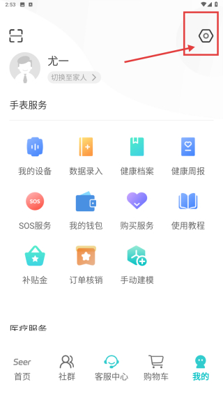 2、在个人中心,点击右上角设置图标,进入设置功能区。