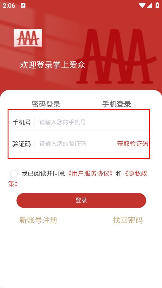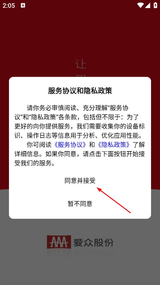 1、打开掌上爱众,弹出服务协议和隐私政策提示,点击同意并接受,进入软件首页。