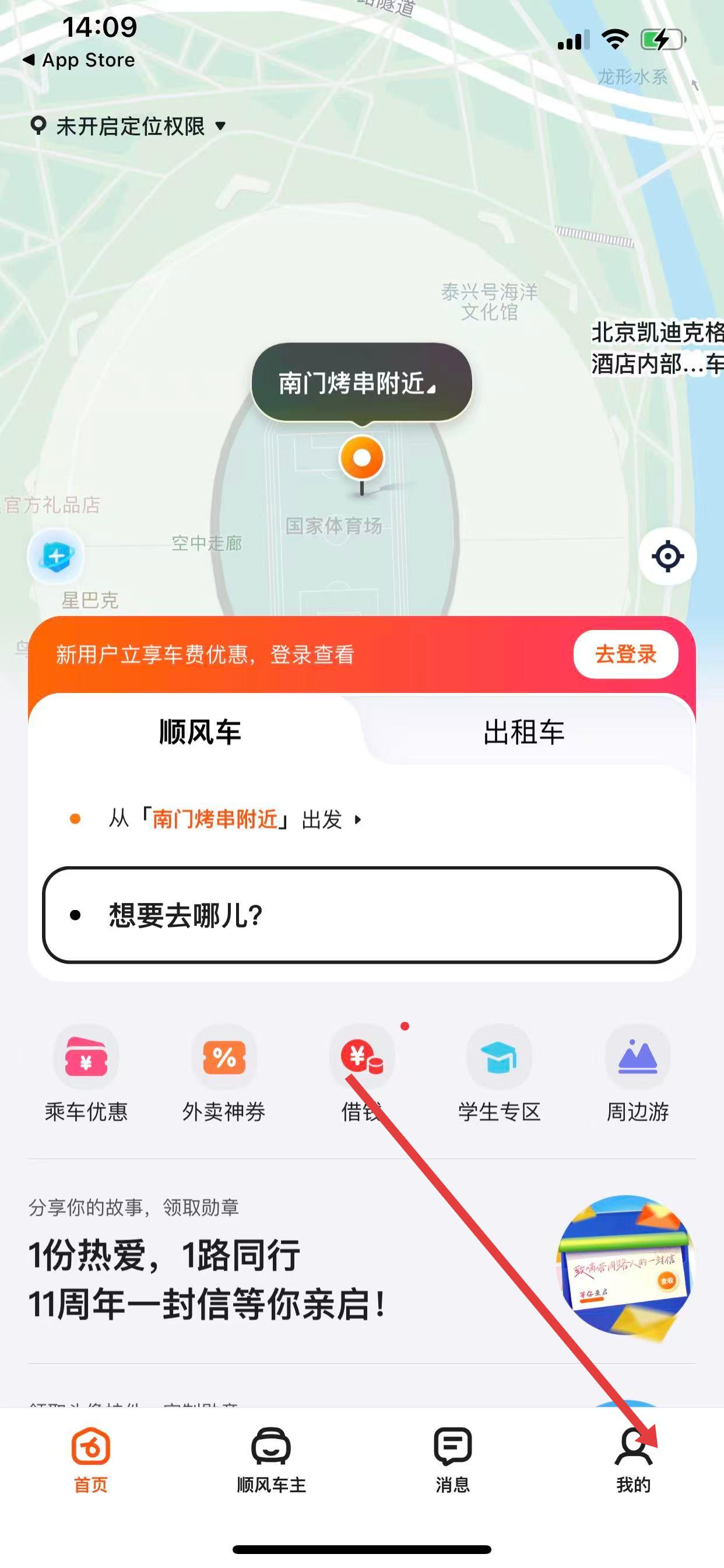 1、打开嘀嗒出行APP,进入首页后,点击底部菜单栏中的我的选项。
