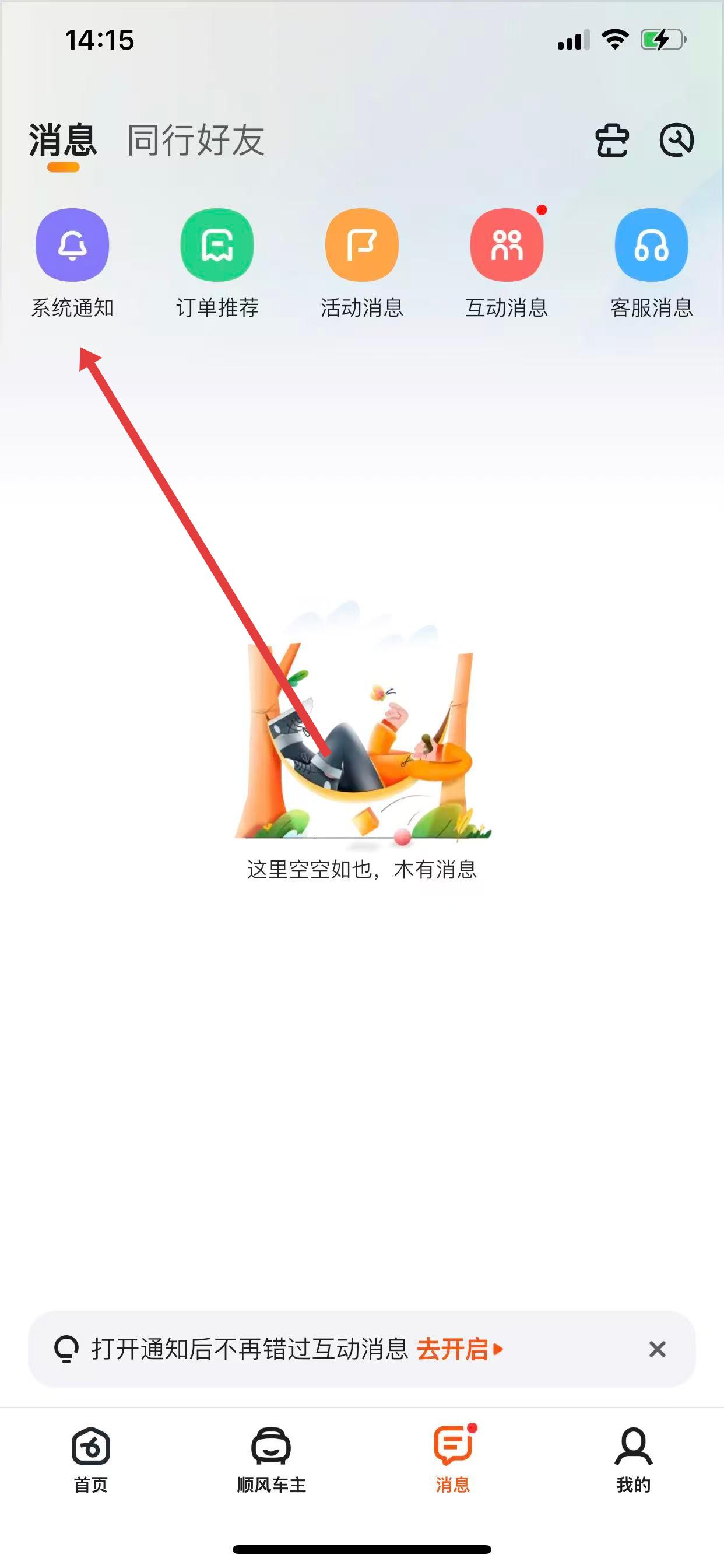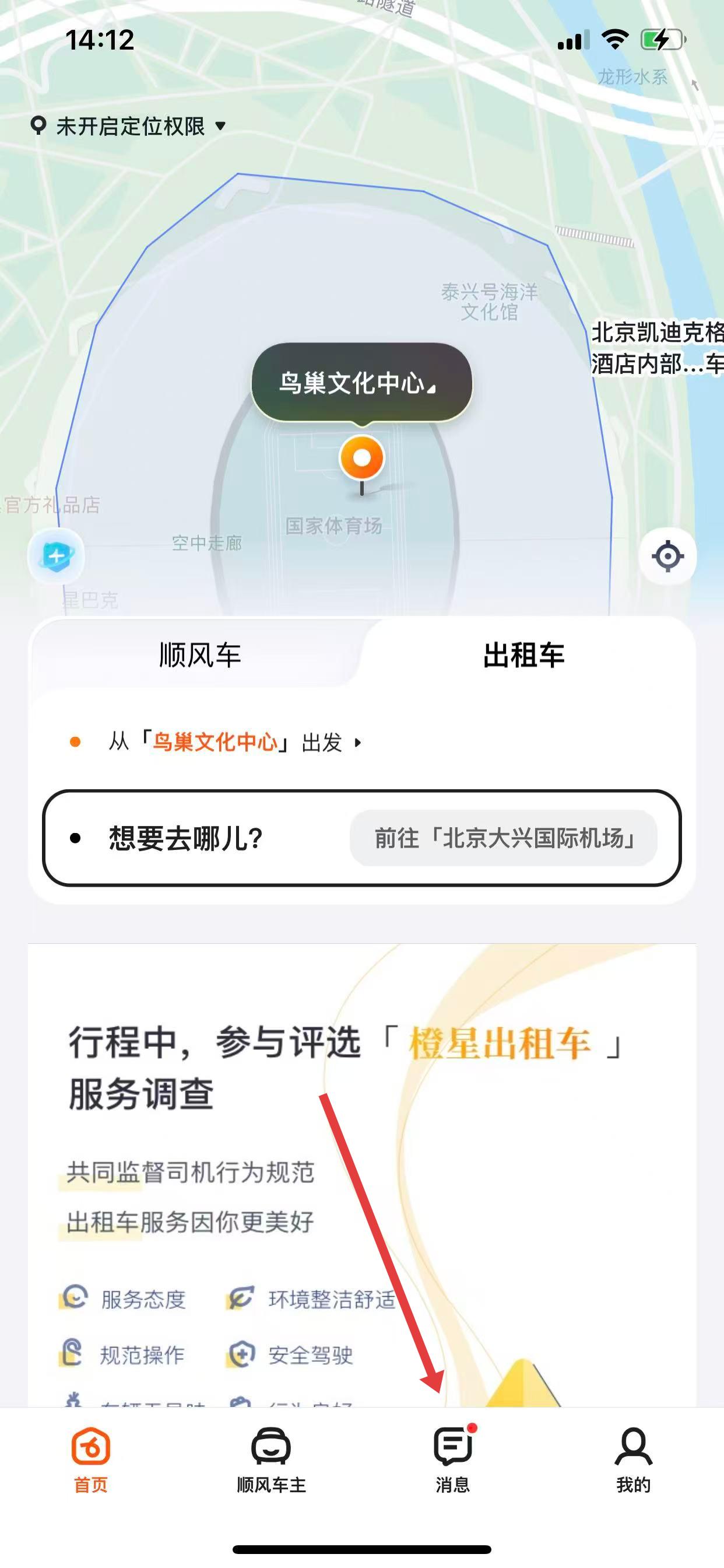 1、打开嘀嗒出行APP,在首页点击底部导航栏中的消息图标。