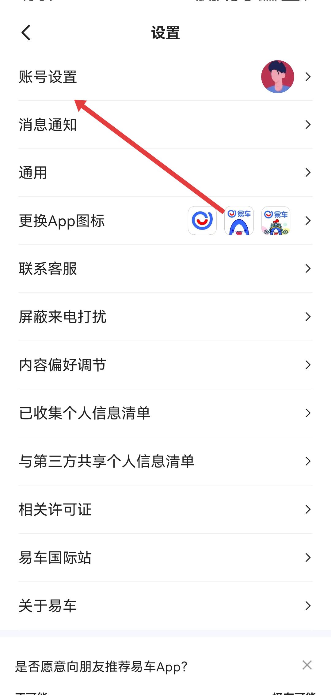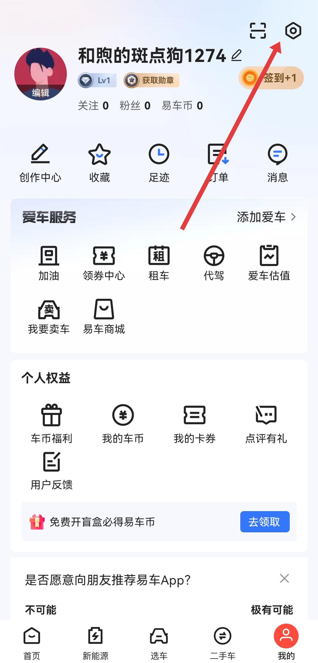 1、打开易车app,然后进入我的页面,需要点击右上角的六边形设置图标。