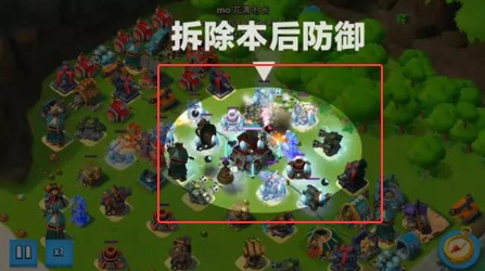3、聚集之后扔出3震一机器小怪,释放英雄技能远程遥控震爆火箭炮(先用火炮炸残血,残血的建筑会成为部队,很快就拆掉了本后的防御建筑。
