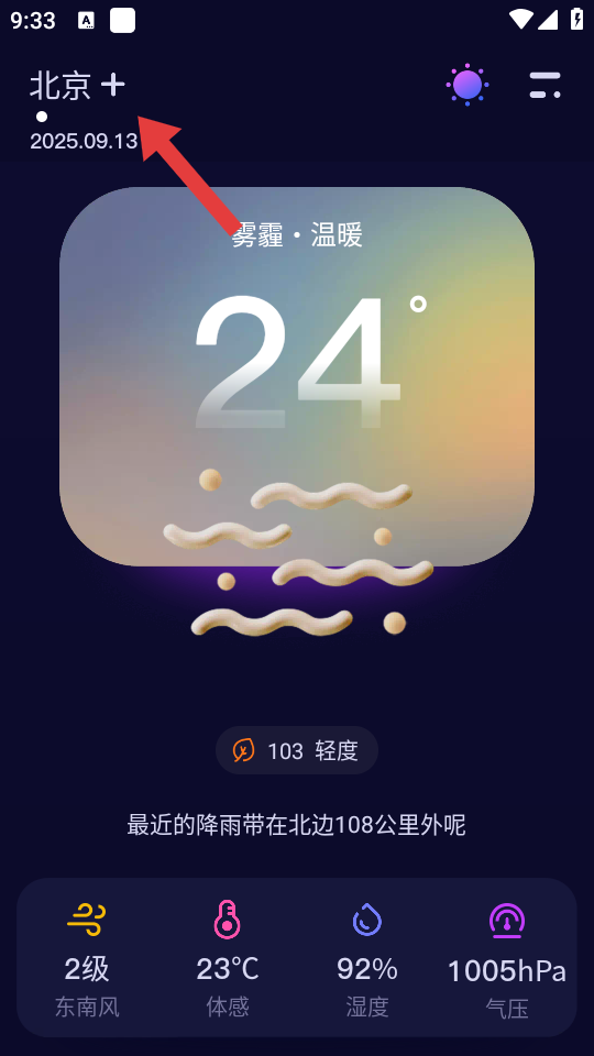 1、在超准天气预报主界面,点击城市名称旁的+号,进入城市管理页面。