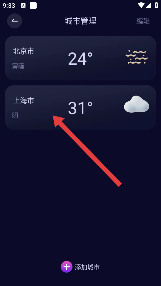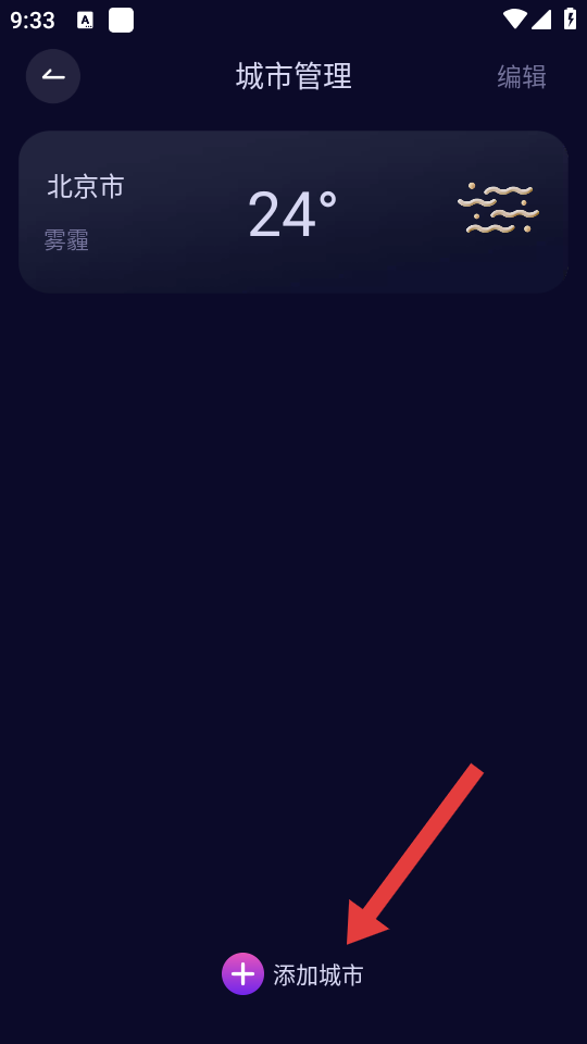 2、在城市管理页面,点击底部的添加城市按钮,进入添加城市界面。