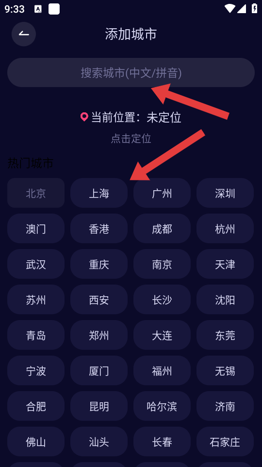3、在添加城市界面,可通过搜索框输入名称,或直接点击热门城市中的目标城市。