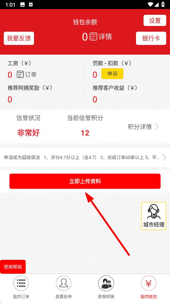 2、在我的钱包页面,点击立即上传资料按钮,进入上传个人资料界面。