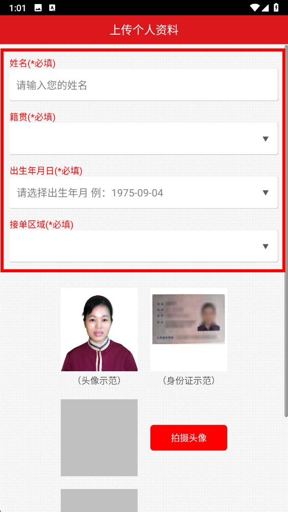 3、在上传个人资料界面,依次填写姓名、籍贯、出生年月日、接单区域等必填信息。