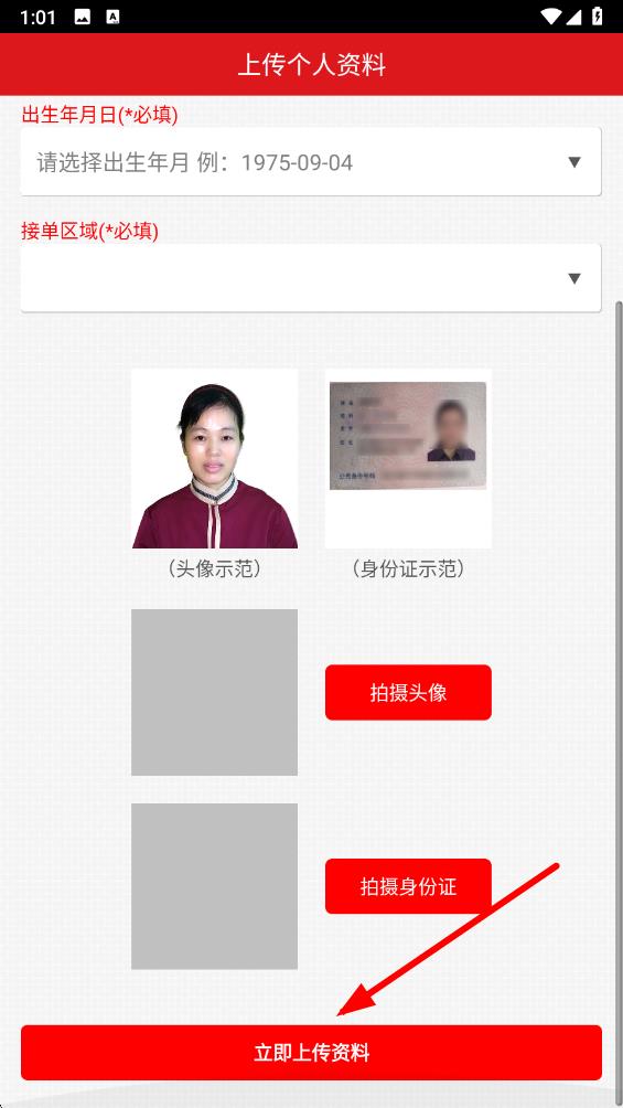 4、填写好信息后,点击拍摄头像和拍摄身份证按钮,分别拍摄并上传头像和身份证照片,最后点击立即上传资料完成个人信息填写与提交。