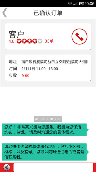 阿姨抢单成功后会立即打电话给雇主确认信息,服务完毕还可以对服务评分,帮助提升阿姨的服务质量