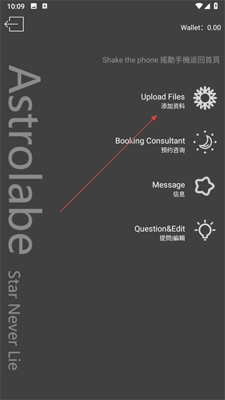 2、在星盘页面,点击添加资料选项,进入资料填写界面。