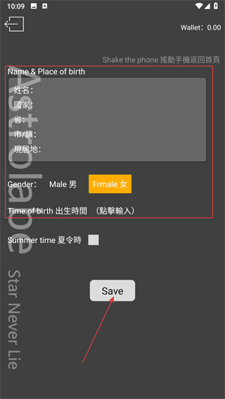 3、在资料填写界面,依次输入信息,选择性别,并输入出生时间,填写完成后点击Save按钮。