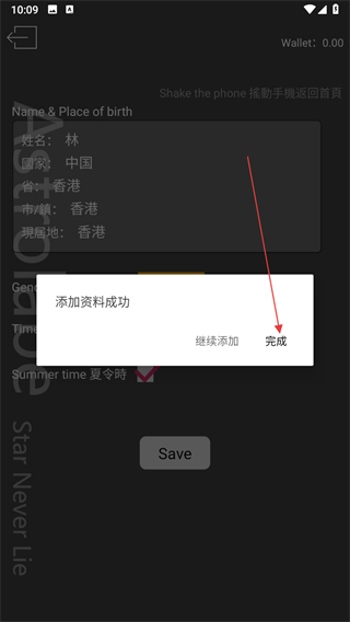 4、点击Save后,点击完成,即可成功添加个人资料用于后续占星相关操作。