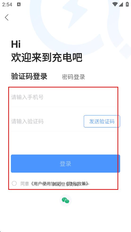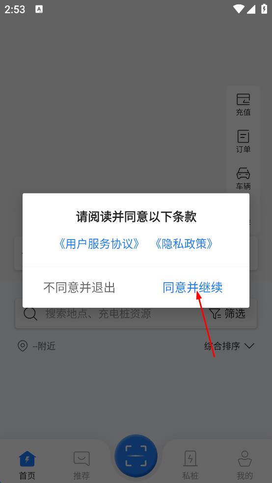 1、打开充电吧APP,在条款阅读弹窗中,点击同意并继续按钮,进入主界面。