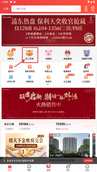 1、打开房产类应用,点击买二手房功能入口,进入二手房查询页面。