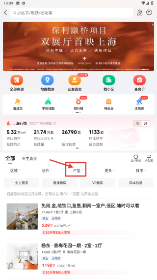 2、在二手房查询页面,点击户型选项,选择一居户型。