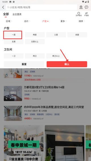 3、点击确认按钮,筛选出一居室的二手房列表。