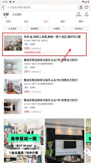 4、在列表中,找到免佣金,地铁口急售,朝南一室户,随时可以看房源条目¥67792/㎡及相关信息。