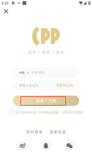 3、登录的操作非常简单,只需要在这个界面中输入自己的手机号与验证码,就可以点击下方的【登录/注册】按键完成自己的账号登录了;
