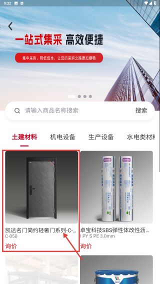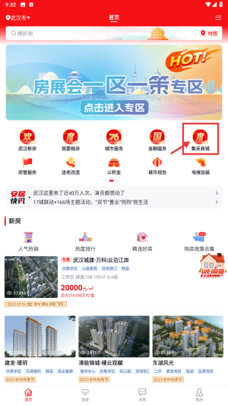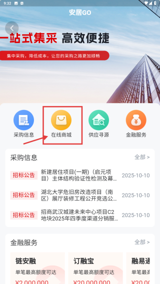 1、打开房产类应用,点击集采商城功能入口,进入集采页面。